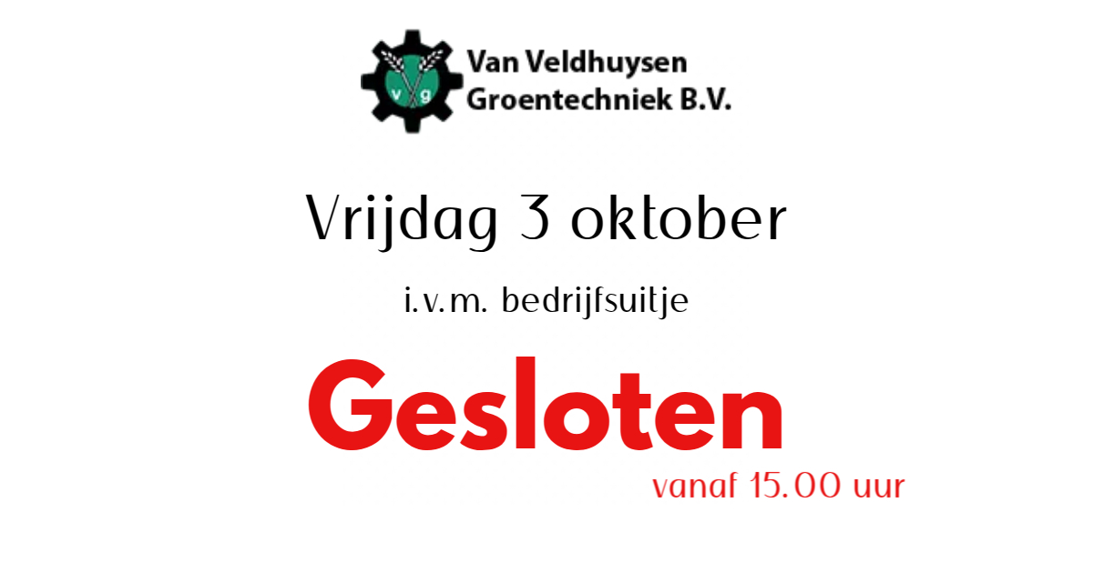 Vrijdag 3 oktober zijn wij vanaf 15.00 uur gesloten wegens bedrijfsuitje.
